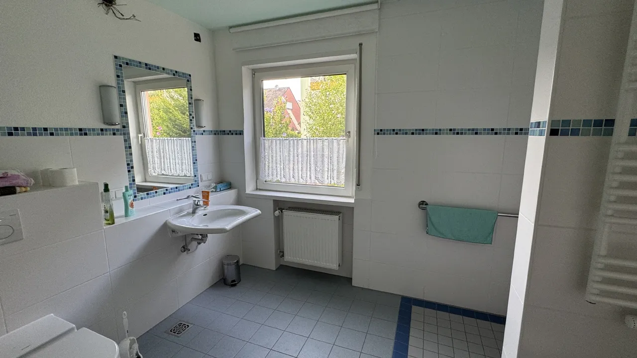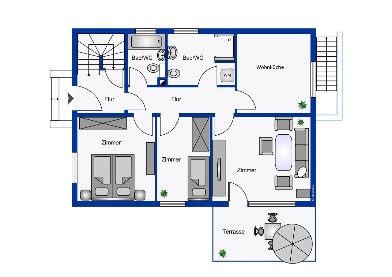 EG: 3 Zimmer, Wohnküche, 2 Bäder/WC, Flur, Süd-Terrasse;