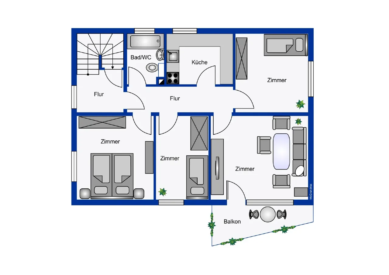 OG: 4 Zimmer, Küche, Bad/WC, Flur, Süd-Balkon;