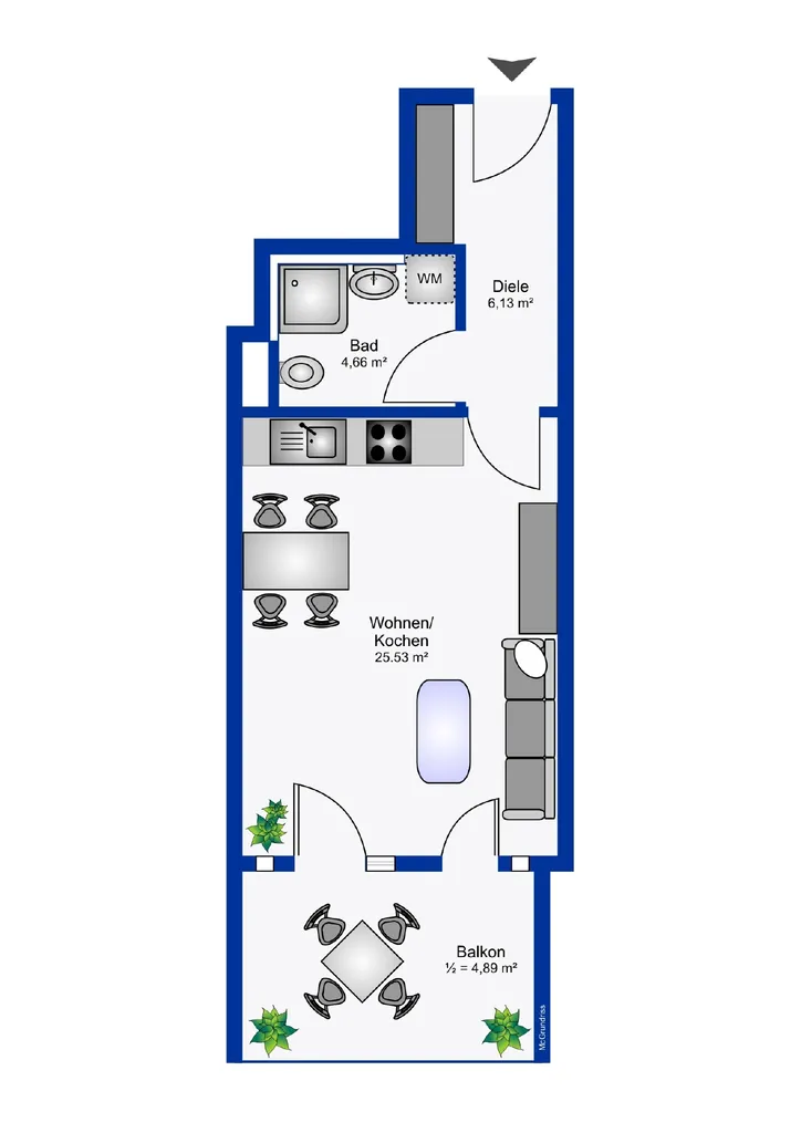 Wohn-Schlafzimmer (ca. 25,53 m²) mit Kochnische und Einbauküche, innenliegendes modernes Bad mit Dusche, WC, Waschbecken und Waschmaschinenanschluß, Flur, West-Loggia;