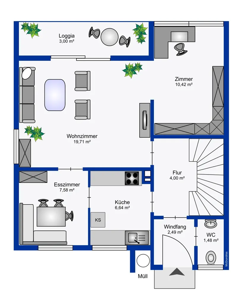 EG: Wohnzimmer mit Nebenraum, Küche mit Essplatz, Gäste-WC, Flur, Windfang und Terrasse;