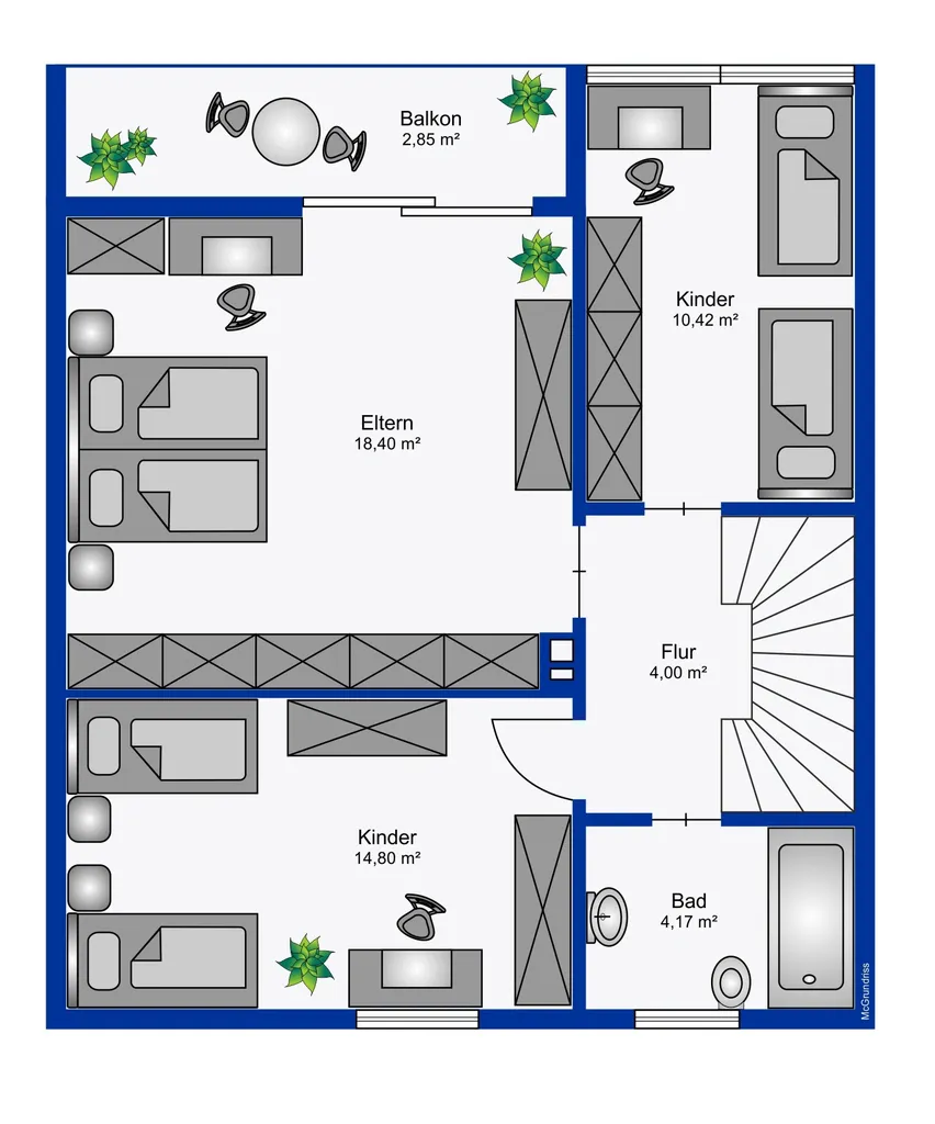 OG: Schlafzimmer, Kinderzimmer I, Kinderzimmer II, Badezimmer, Flur und Balkon;