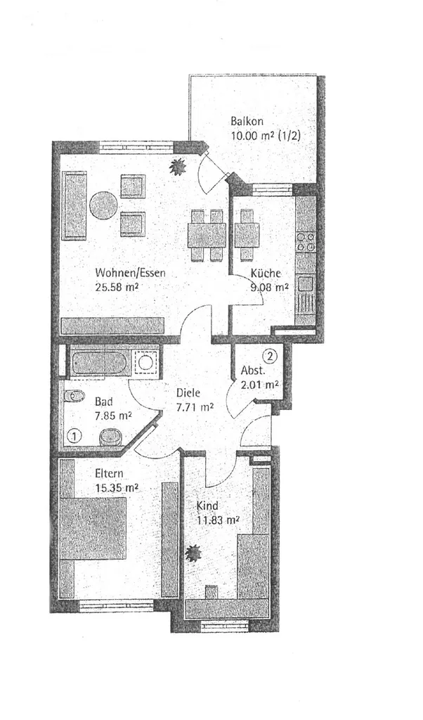 Wohn-/Esszimmer, Elternschlafzimmer, Kinderzimmer, Küche, innenliegendes Badezimmer mit Badewanne, Dusche, Waschbecken, WC und Waschmaschinenanschluss, Diele, Abstellraum, West-Balkon;