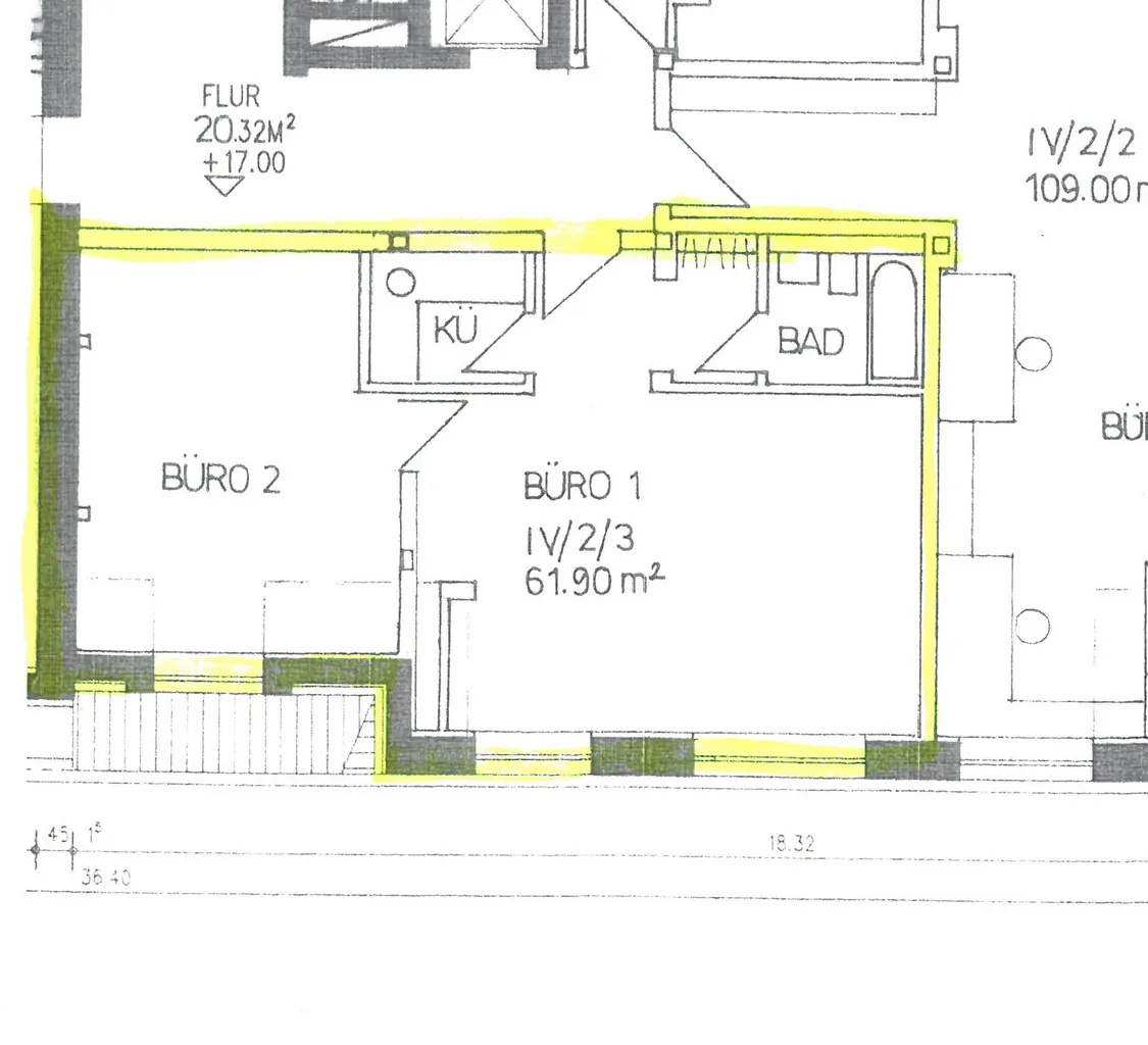 Büro 1, Büro 2 mit Einbauschrank und dahinter liegendem Abstellbereich, aktuell abgetrenntes Büro 3, Teeküche ohne Fenster, innenliegendes Bad;